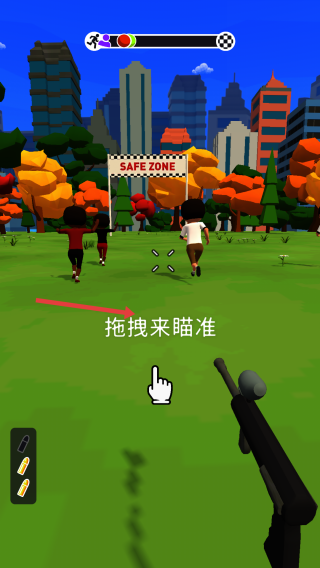 3、进入对战阶段,拖拽屏幕瞄准,射击敌人,向“SAFE ZONE”推进,存活到最后或完成目标,赢取胜利。