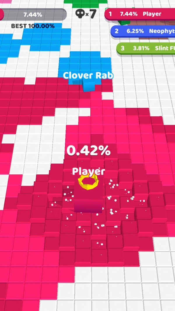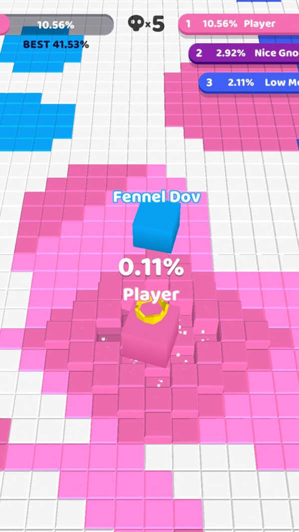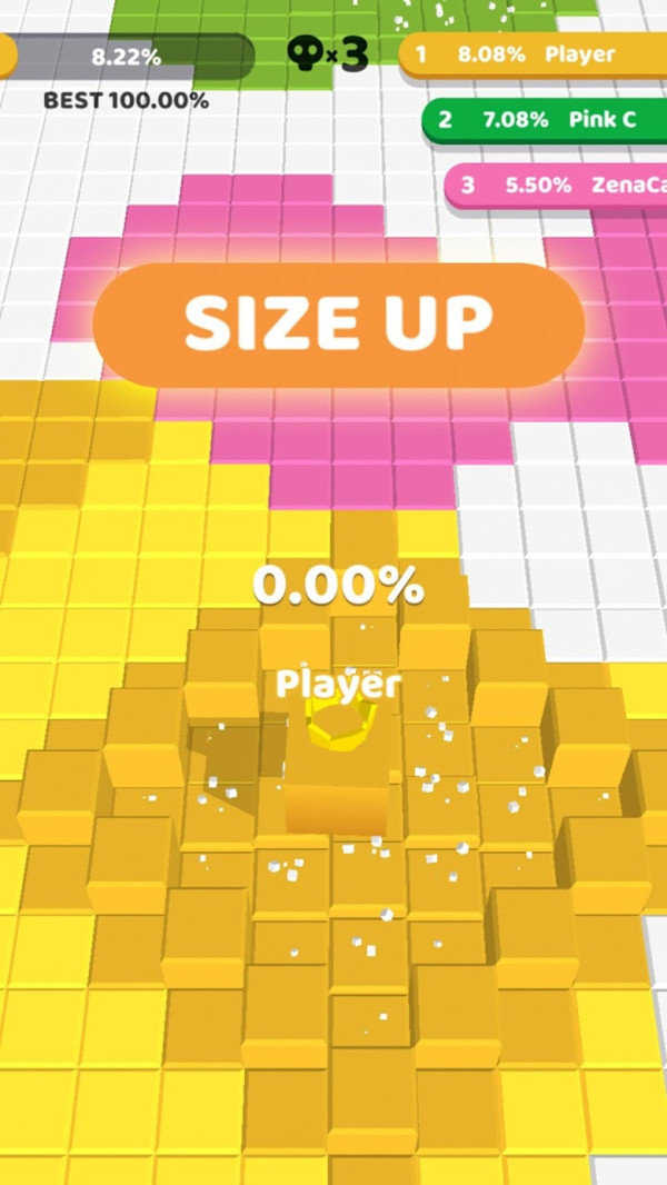 2、地盘争夺玩法:核心目标为染色占地,狭小地图中与对手博弈,几个方块的差距即可决定胜负。