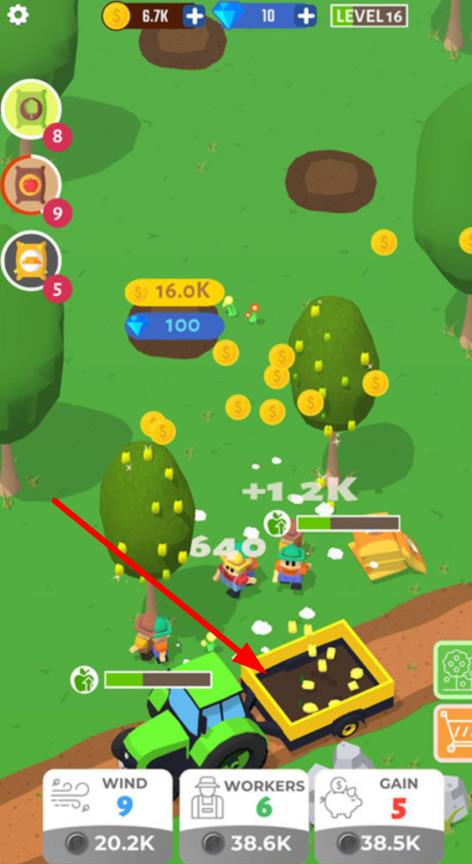 2、将收获的水果拖至市场出售获取金币,用收益升级农场工具(如自动灌溉系统)或解锁新地块。