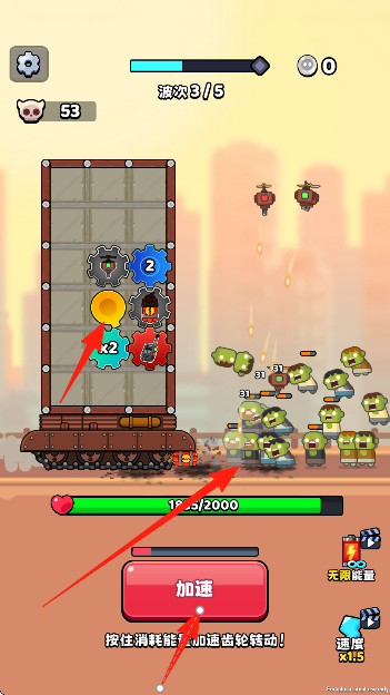 2、放置策略经营:采用放置玩法,离线也能自动战斗获取资源,同时融入策略元素,需合理搭配战车武器与科技技能,针对僵尸弱点制定防御策略。