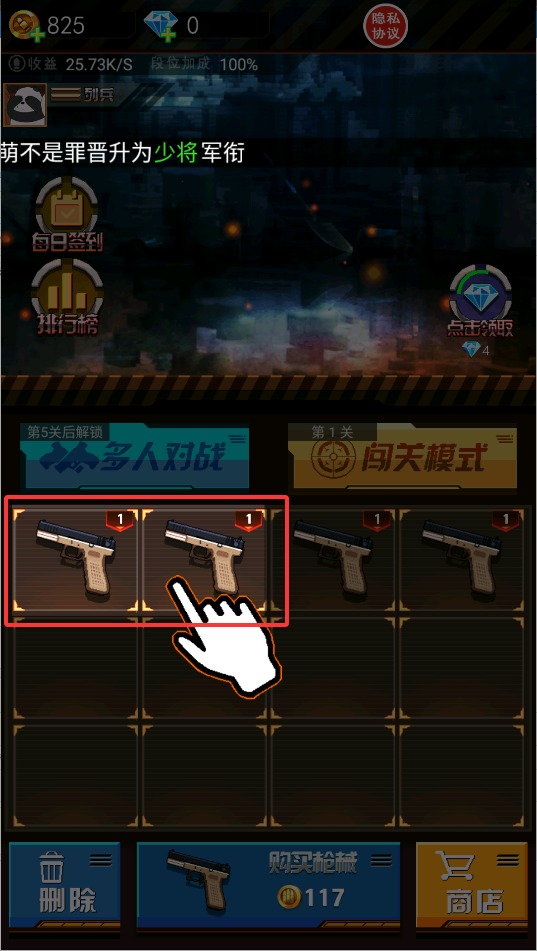 1、开局后左右滑动组合相同颜色的武器模块,将基础枪械升级为强力装备,注意优先合成范围攻击的特殊武器。
