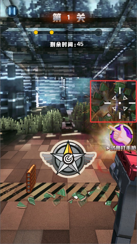 2、左手控制角色移动躲避弹幕,右手调整射击准星锁定敌机,利用场景障碍物掩护自己减少伤害。