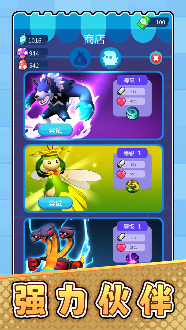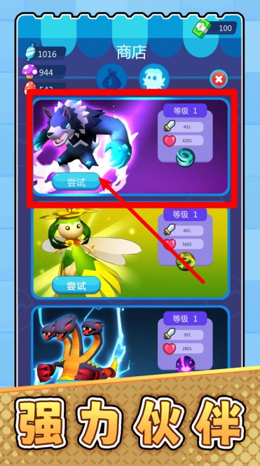 2.商店试用功能:点击“尝试”按钮可预览强力宠物属性,提前了解攻击力与生命值,方便玩家判断是否值得培养与投资。