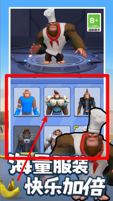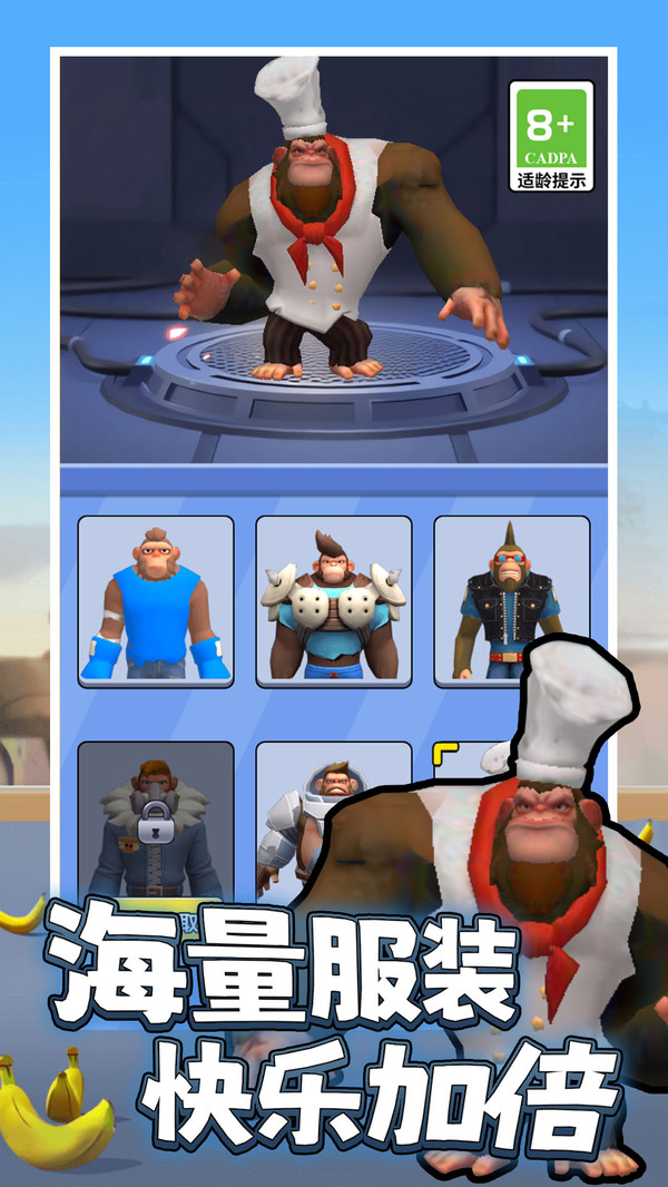 1.选择酷炫皮肤:玩家可自由切换各类猩猩造型,享受装扮角色带来的个性化乐趣与视觉冲击感。