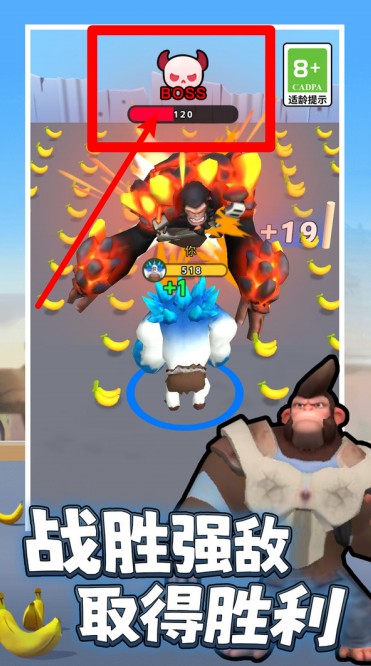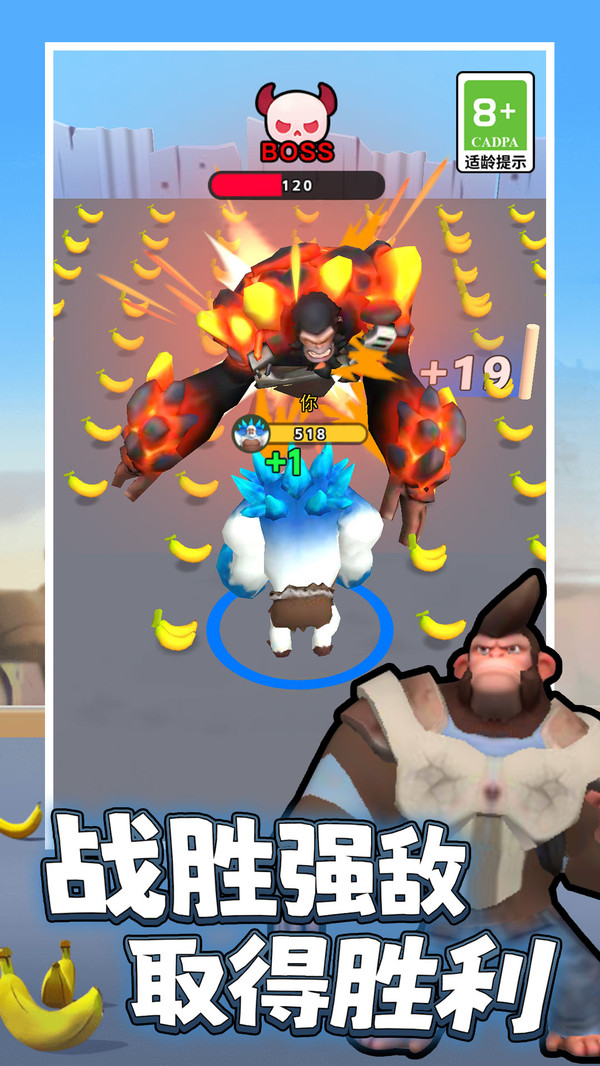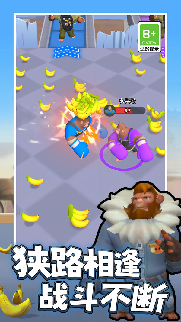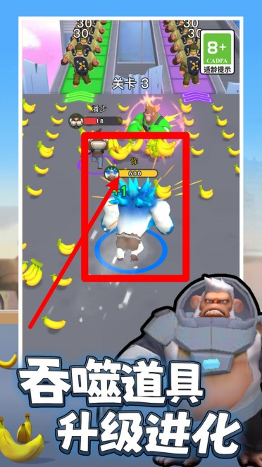 2.吞噬进化机制:在战斗中不断吞下香蕉补充能量,完成进化升级快速提升体型与战斗力打爆对手。