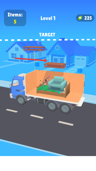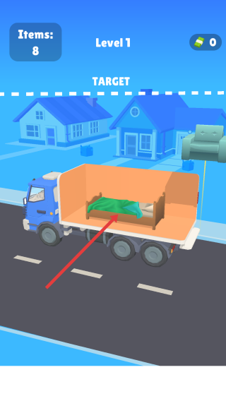 1、装载操作:Level1点击屏幕,使空中家具落入卡车车厢堆叠。