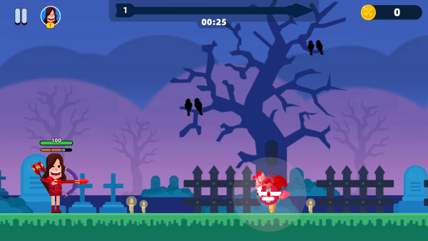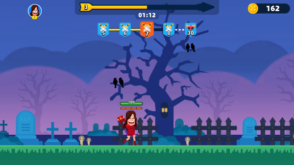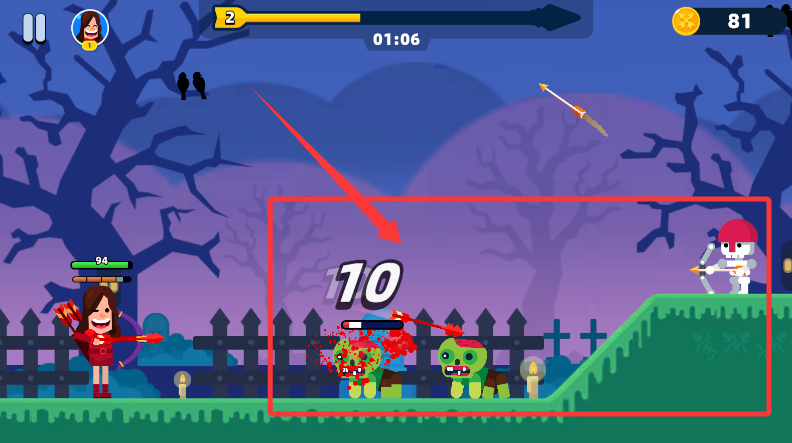 2、进入关卡,操控角色用弓箭精准射击僵尸等敌人,但需留意血量与时间。