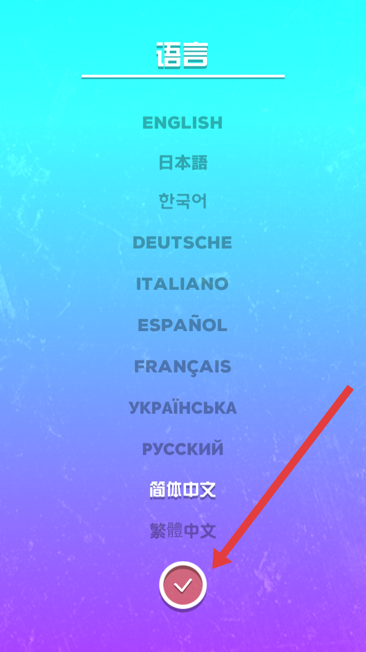 1、在出路的语言选择界面,选定【简体中文】后,点击底部红色对勾按钮,确认语言设置。