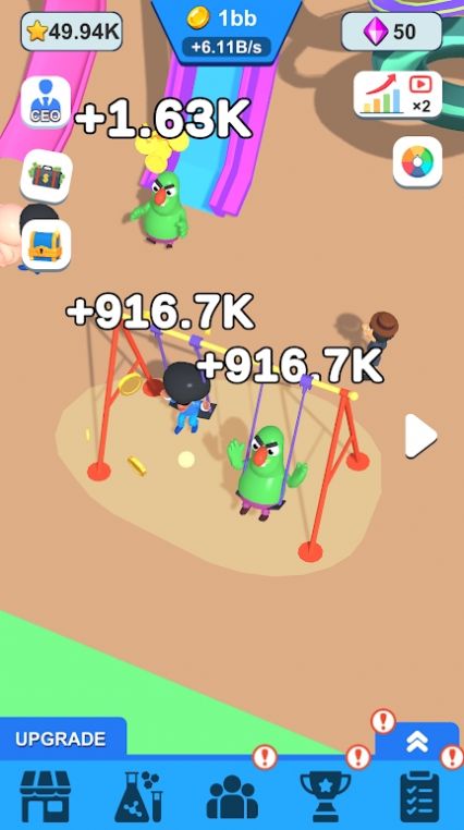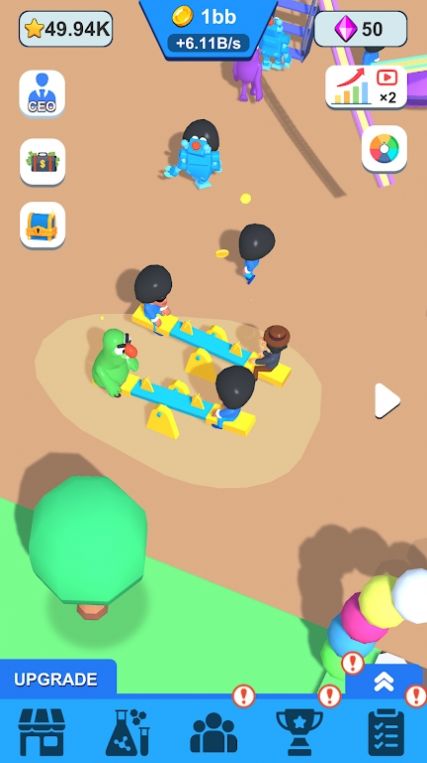 2、轻松经营模式:采用放置玩法,离线也能自动赚取收益,搭配一键升级功能,适合碎片化时间管理游乐场。