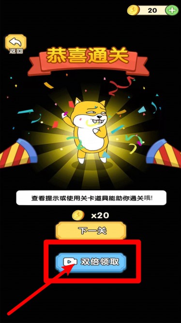 3.通关奖励展示:完成关卡后出现恭喜通关画面,玩家可通过观看双倍领取广告获得更多金币奖励,激励继续挑战更高难度。