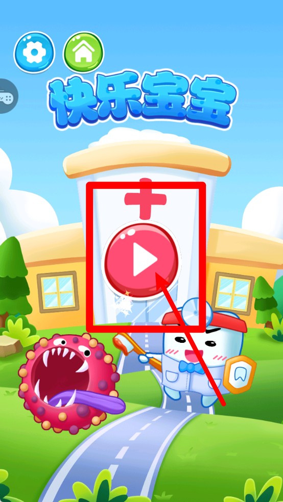 1.点击开始按钮进入游戏:主画面中点击中间的红色播放键,即可进入快乐宝宝的诊疗世界,准备迎接各种挑战任务。
