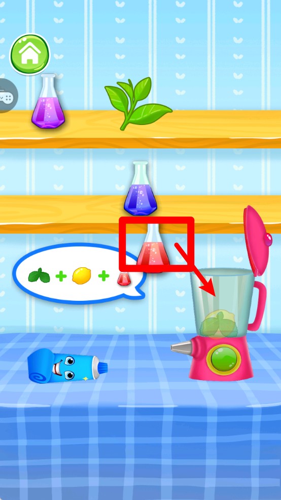 2.按照提示投放材料:根据泡泡提示将薄荷、柠檬和试剂依序放入搅拌机中,配制专属牙膏配方,步骤简单清楚又直观。