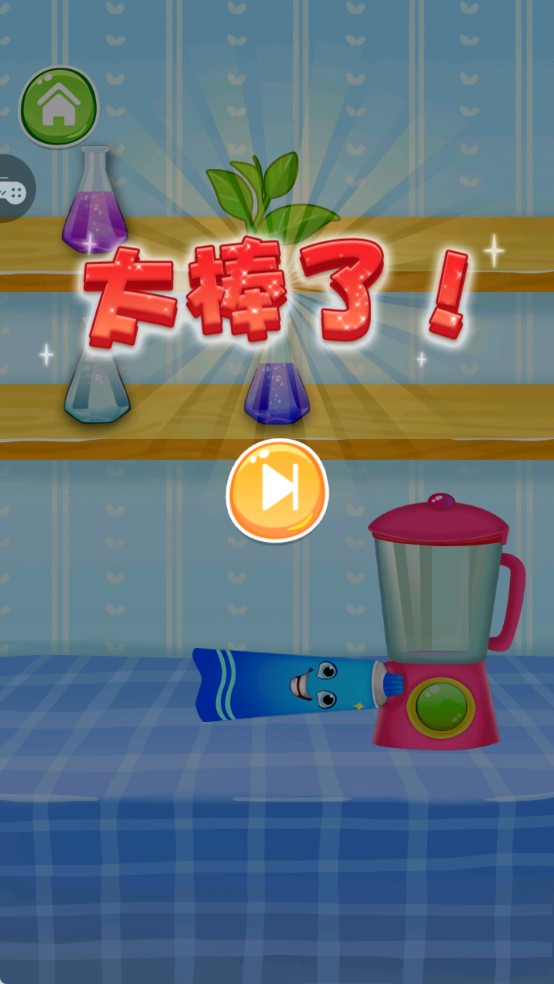 3.成功合成牙膏会提示:当配方正确无误并搅拌完成后,会弹出“太棒了”的提示动画,代表牙膏制作成功可以继续使用。