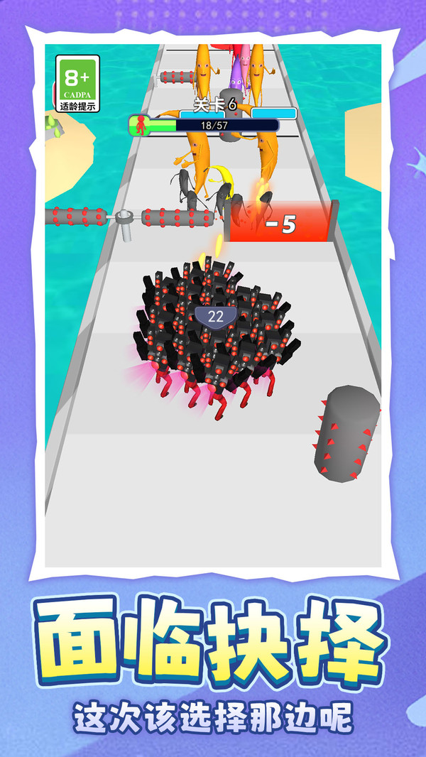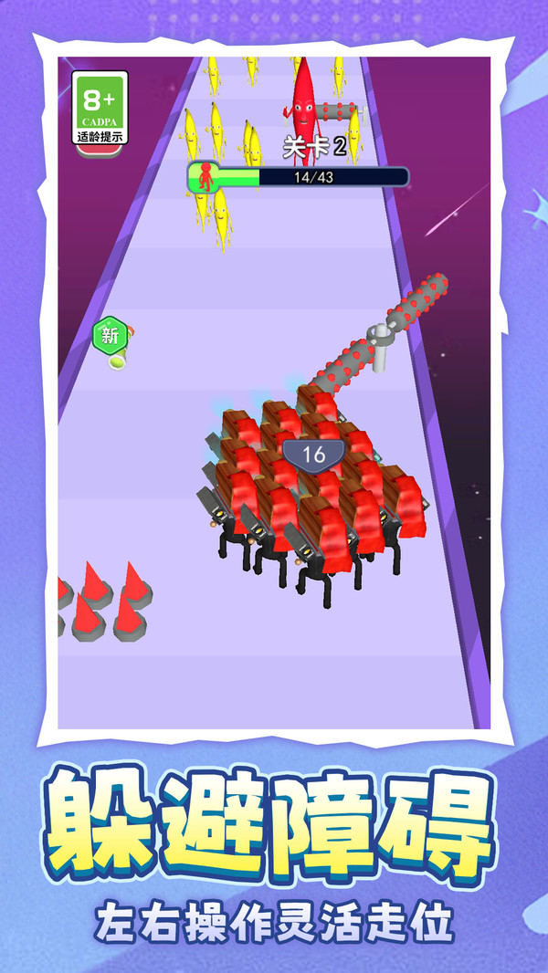 1.滑动控制方向:玩家只需滑动操作角色移动方向,避开道路障碍,同时优先选择加人数与加攻击力的路线快速成长迎战终点敌人。