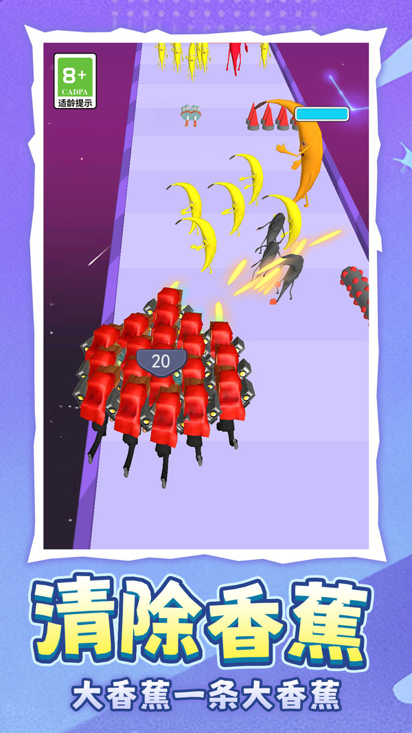 香蕉战场超有病但超好玩,怪物全是香蕉人,主角却是监控设备组队冲锋,设定离谱到笑出声。一路狂奔躲障碍、招小弟、升装备、冲爆终点大怪,体验感直接拉满。玩法简单却上头,节奏快爽感爆表,香蕉战场根本是下班后解压神器!