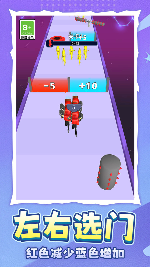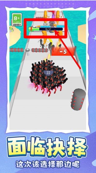 2.前方出现选择门,左边-5右边+10,别犹豫太久,选对门才能保证队伍越打越壮不减员。