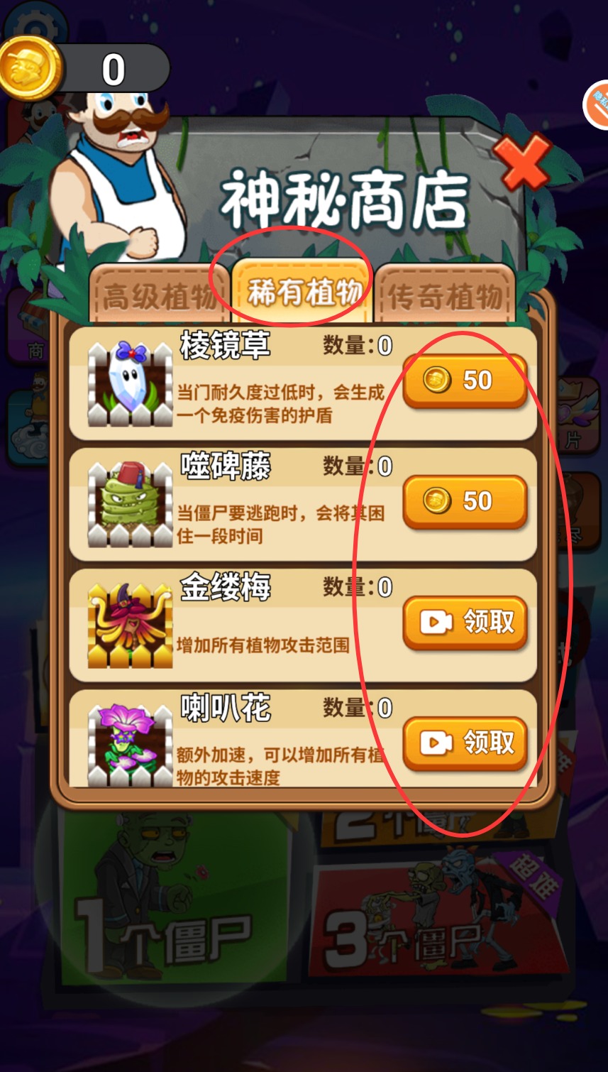 1、进入游戏主界面点击商店按钮,在稀有植物分类中可以查看所有可购买的特色植物,消耗金币或钻石即可解锁。