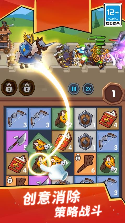 1、 创新5x5棋盘消除机制,支持基础三消、特殊形状消除等10种消除方式。通过合成可升级近战、远程等8大类兵种。