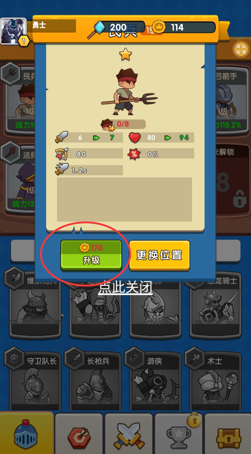 1、进入兵营界面选择需要强化的单位,消耗指定数量金币即可提升该兵种的属性和技能效果。
