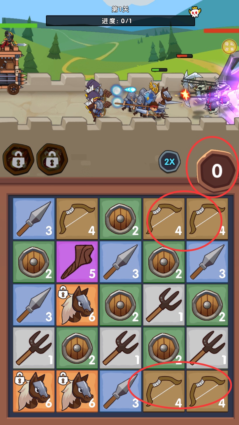 2、游戏界面顶部显示当前关卡进度,右侧行动点数用于训练士兵,同类型士兵可进行合成进阶。