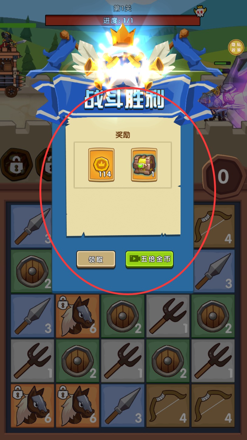3、关卡结束时根据表现结算奖励,包含金币和随机宝箱,领取后自动返回主界面准备下次挑战。