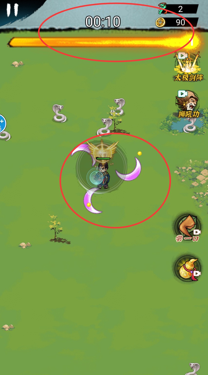 3、游戏界面顶部显示当前关卡进度和游玩时长,角色会自动攻击周围敌人,通过滑动屏幕控制移动方向。