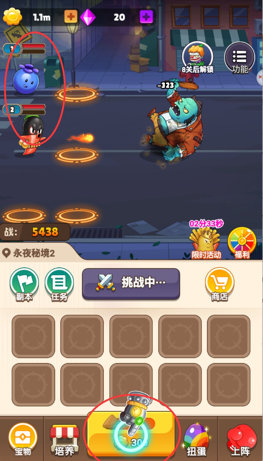 2、选择挑战关卡后,植物会自动攻击来袭的僵尸,点击植物消耗金币可提升其攻击力和生命值。