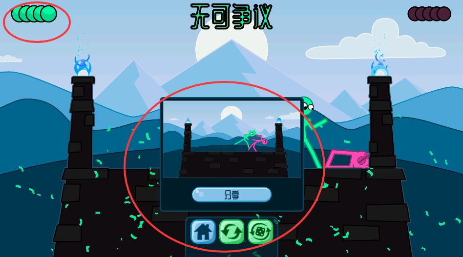 3、通过连续攻击将五个计分圆点全部点亮即可获胜,结束后可选择返回主界面或分享战绩至社交平台。