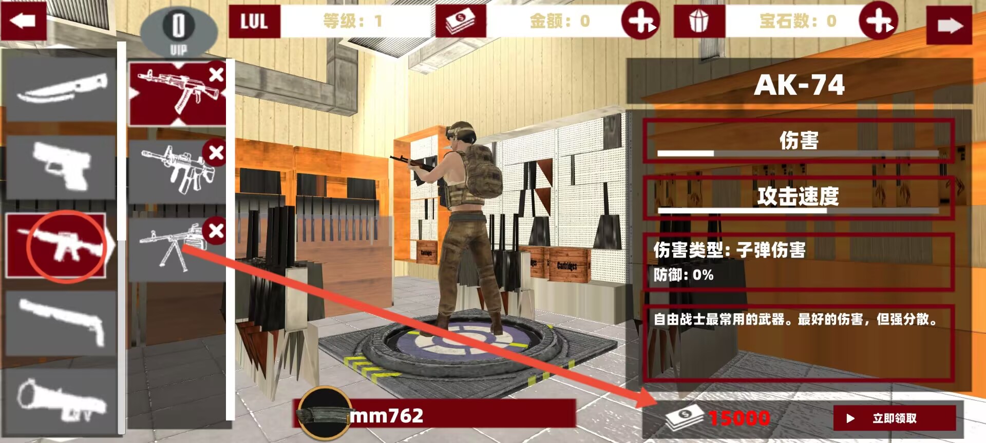 1、游戏主界面点击服饰标识进入军械商店,选择任意武器图示可查看详细属性数据、购买价格及装备按钮。