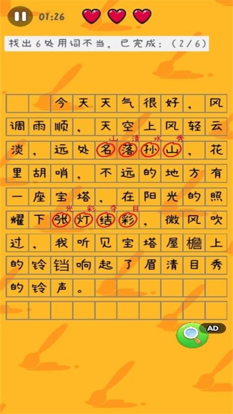 找茬你行吗手机版带来趣味的文字挑战,需要观察细节完成批改任务,操作简单直观,点击标记即可完成互动,画面风格清新简约,文字设计清晰易读,随着游戏推进,可解锁新题型和特殊道具,适合喜欢休闲益智的玩家尝试。