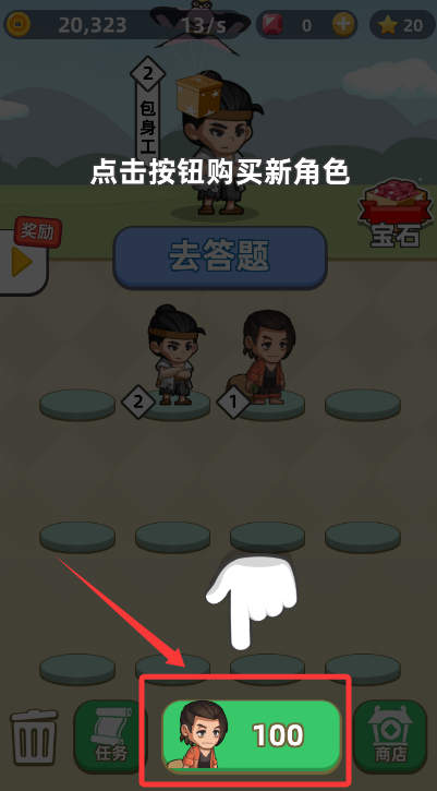 1、游戏初始阶段,通过点击按钮购买新角色,丰富你的成语挑战阵容。