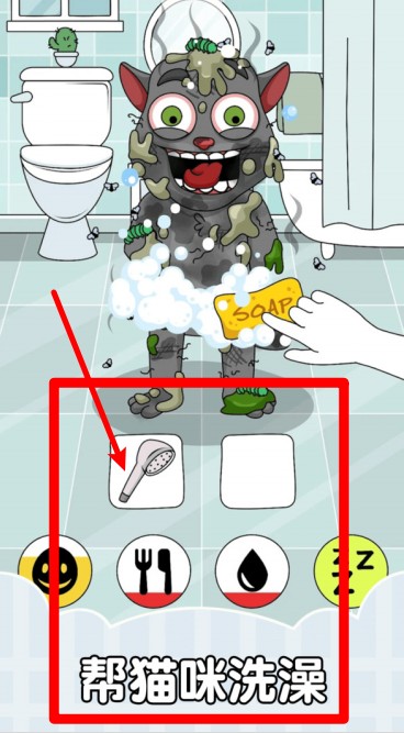 1.清洁互动系统:通过点击莲蓬头图标为猫咪冲洗泡沫污渍,玩家需亲自操作喷头与肥皂,完成全流程的清洁任务。
