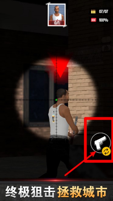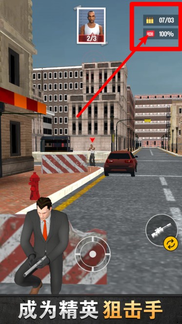 1.精准瞄准射击:玩家需拖动瞄准镜寻找目标部位,释放狙击按钮进行致命打击,完成击杀越精准评分越高。