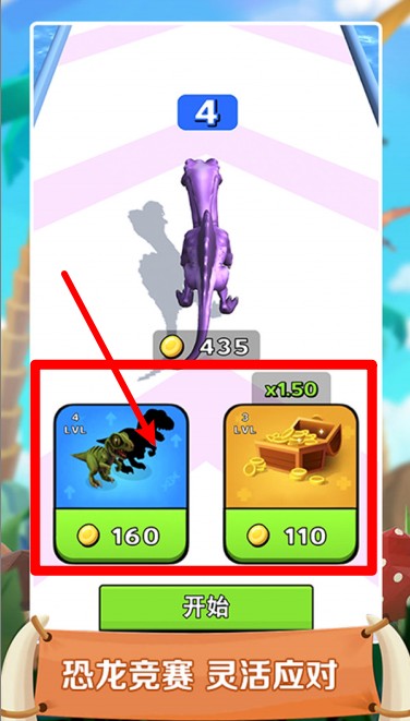 2.恐龙升级选项:赛前可选择不同等级恐龙或金币加倍卡,灵活配置策略,让比赛过程更有变化与挑战。