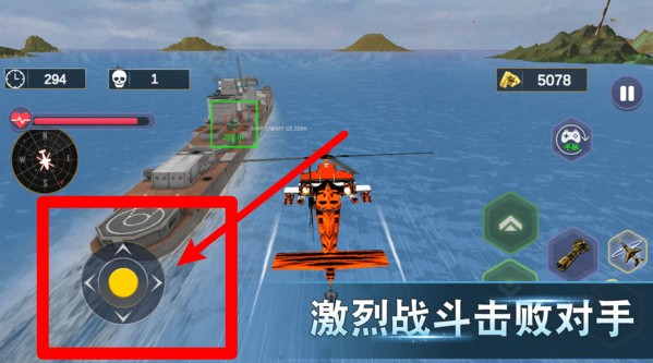 3.操控直升机攻击敌舰:使用左侧虚拟摇杆控制飞行方向,配合右侧武器按钮展开攻击,精准打击敌方船只赢得战斗优势。