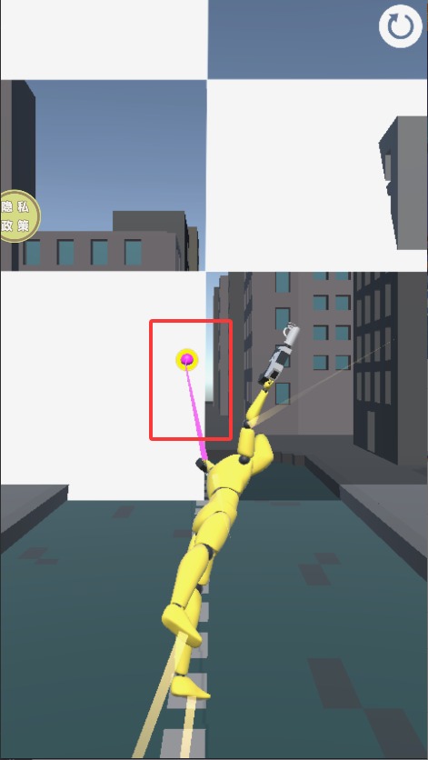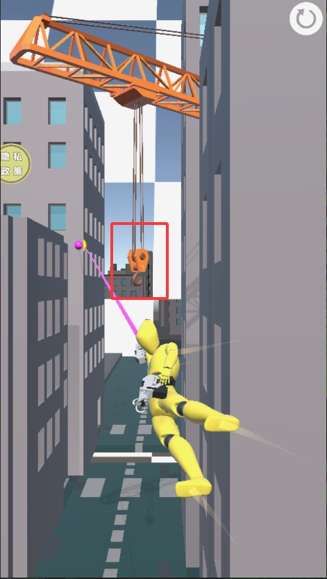 3、遇到无合适抓钩点时点击右上角刷新键,系统会重新生成可攀附的建筑结构,每次刷新消耗一个道具。
