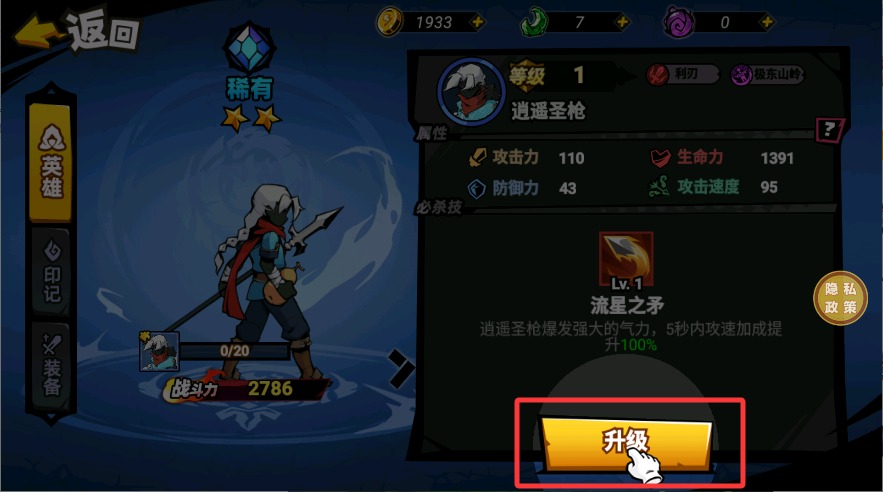 4、成功通关后进入角色强化界面,消耗获得的金币提升攻击力或生命值,为后续更高难度挑战做好准备。