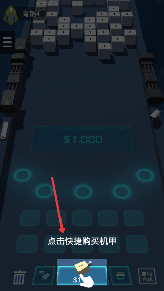 1、在机甲合成游戏中,点击快捷购买按钮,花费对应金币购买机甲,增加战力。