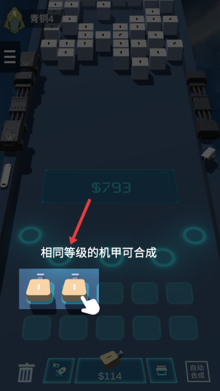 2、将相同等级的机甲拖到一起,触发合成,获得更高级机甲,提升战斗能力。