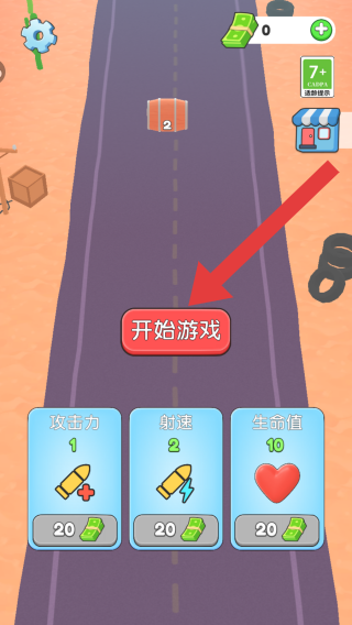 1、有开始游戏按钮,可提升攻击力、射速、生命值各需20货币,点击开始游戏可进入玩法环节。