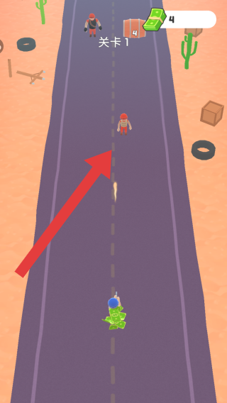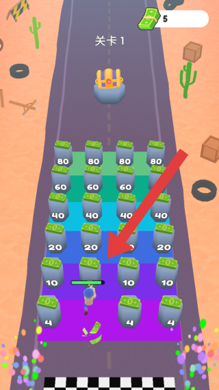 3、显示关卡1,角色在道路上收集货币方块,属于融合收集、闯关元素的类型,玩家操控角色前行,收集货币提升能力。