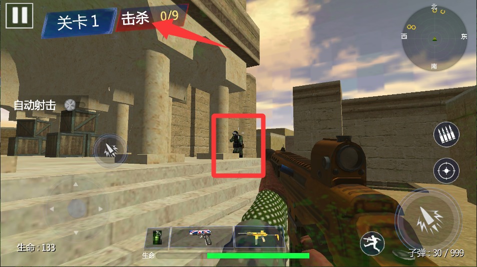 4、按住射击键进入瞄准模式,准星变红时松开手指爆头击杀,连续消灭五个目标可触发慢动作特效。