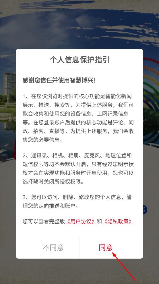1、打开智慧博兴APP,在弹出的个人信息保护指引页面,认真查看相关内容后,点击同意按钮。