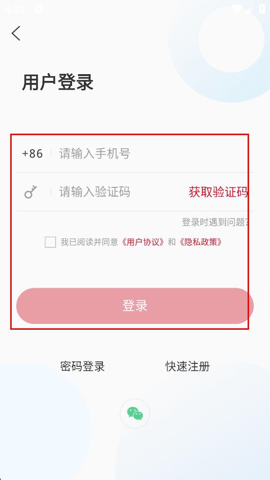 4、在用户登录界面,勾选我已阅读并同意相关协议,再输入手机号和验证码进行登录。