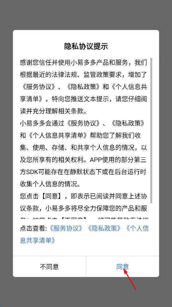 1、打开小易多多APP,在弹出的隐私协议提示页面,仔细阅读相关条款后,点击同意按钮。