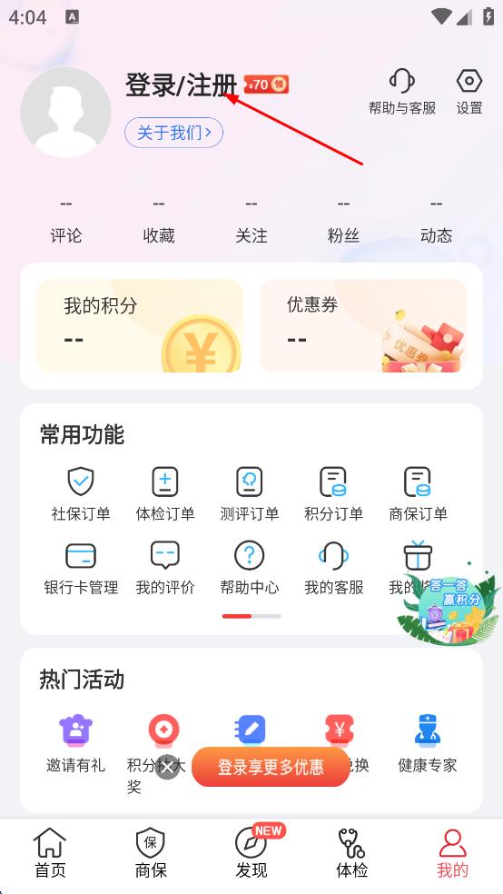 3、在个人页面,点击上方登录/注册按钮,进入用户登录界面。