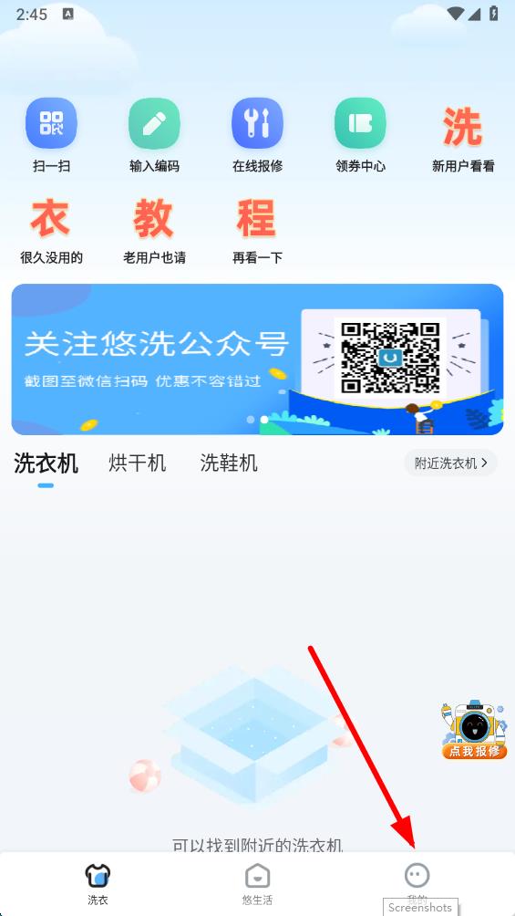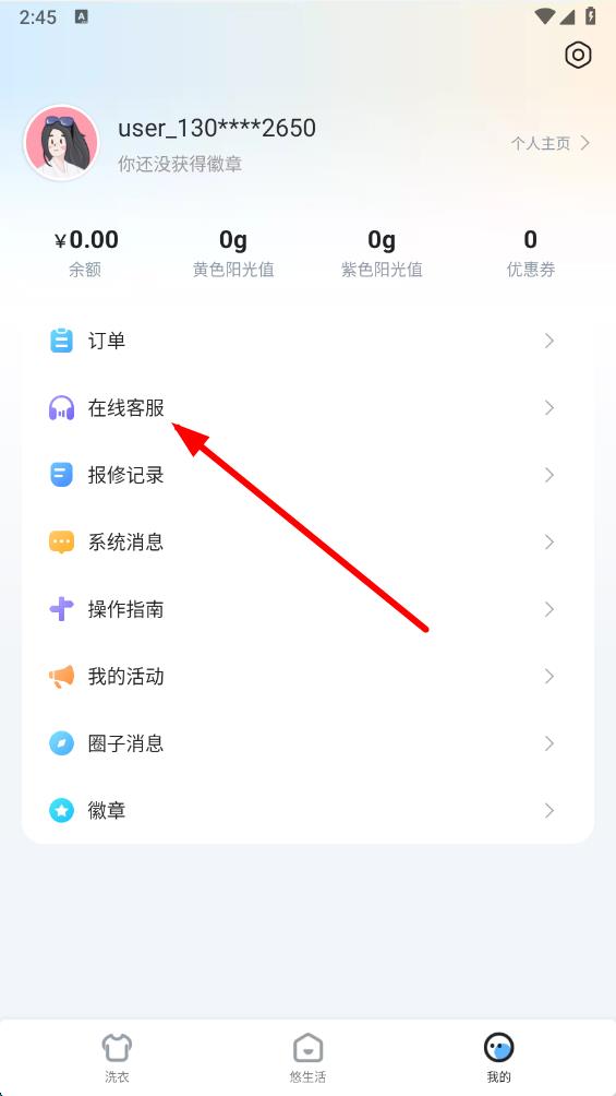 1、打开悠洗洗衣APP,点击底部导航栏中的我的图标,进入个人相关页面。
