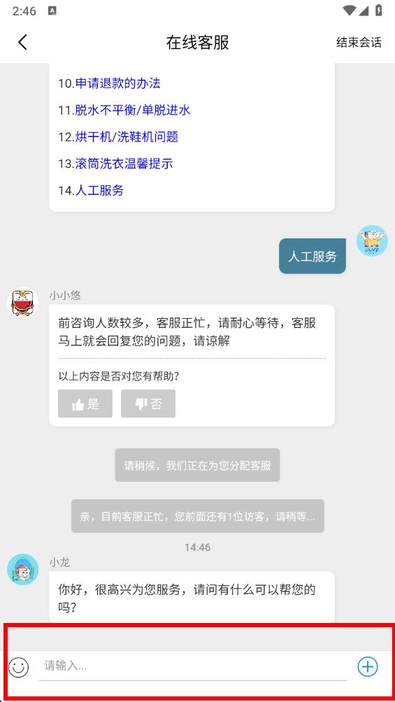 4、点击后等待系统分配客服,与人工客服取得联系后,在输入框输入问题并发送,即可进行沟通咨询。