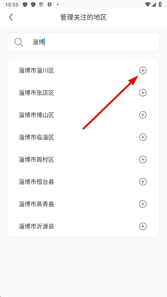 5、比如淄博,在搜索结果中,点击目标地区右侧的加号,即可成功添加该关注地区。