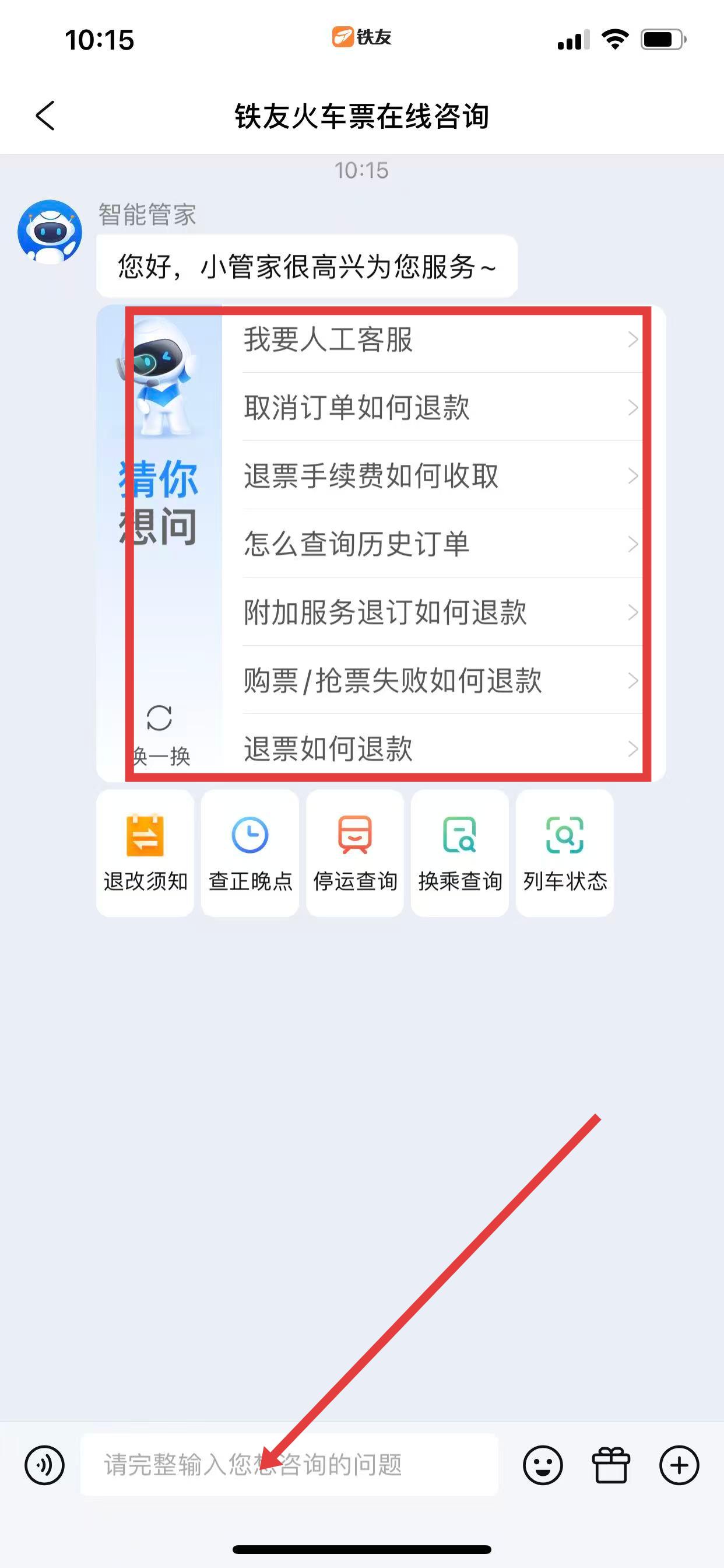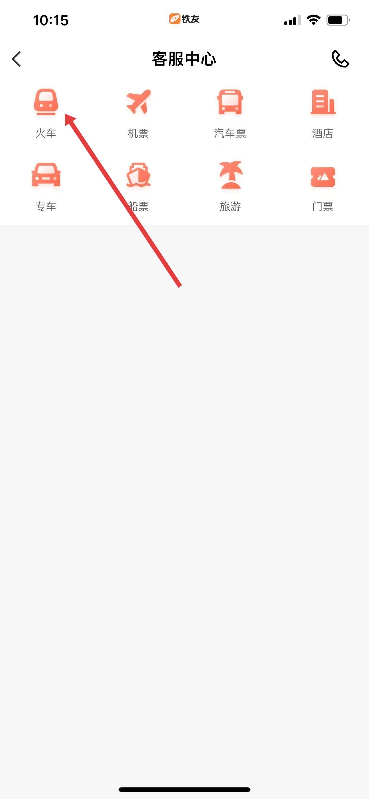 3、在客服中心页面,点击火车图标,进入铁友火车票在线咨询界面。
